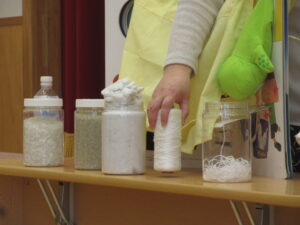ペットボトルは細かく砕いて、綿になって、糸になって…エプロンや洋服に生まれ変わることを知りました。