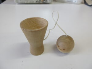 これがおちょこけん玉。小皿に乗せるのはとっても難しいです。