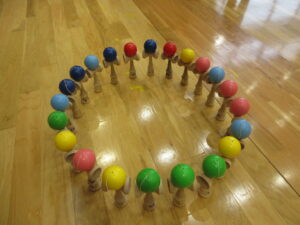 「けんだましょ~うぶ」(けん玉勝負)みんなでいろいろな技を挑戦しています。