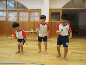 けん玉はとっても難しいけど、あきらめずに繰り返し繰り返し取り組みました。なかなかできなくて悔しい思いもしました。でも、できた時はとっても嬉しくて、キラキラの笑顔を見せてくれました。