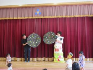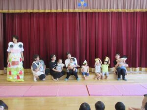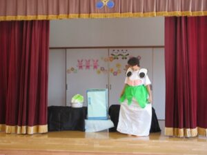 みんなが先生に「みてみて~!」と言っていると、ひょこっと可愛いオバケちゃんがステージから出てきました👻