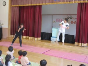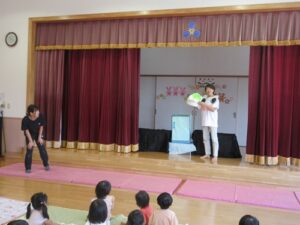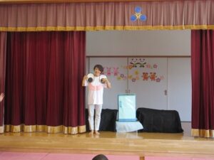 先生がお話しをしていると何かがステージの後ろを歩いていましたよ!