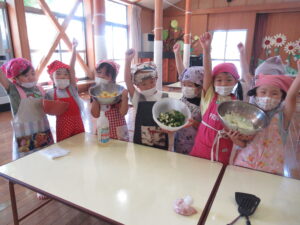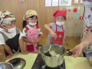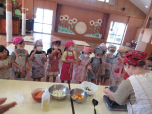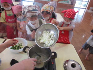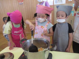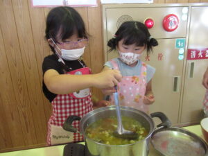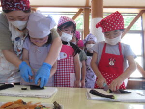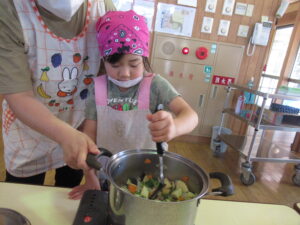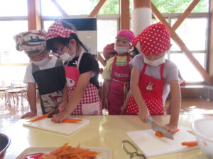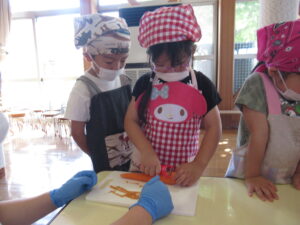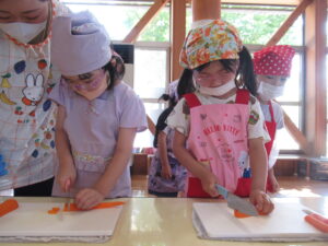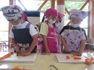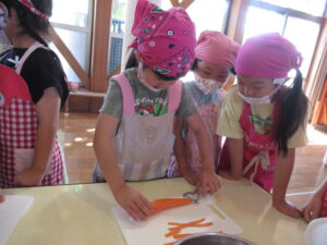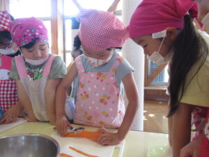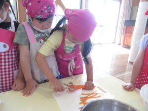 そら・にじ組さんはピーラーで皮むきをしたり、包丁で野菜を切っていきますよ~!