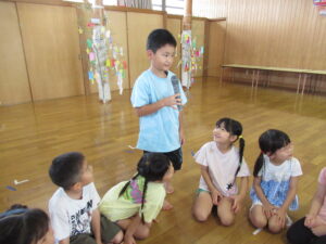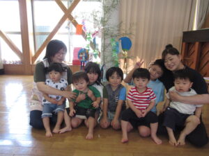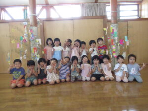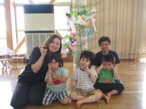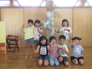 笹と七夕飾りの前でみんなでパシャリ📷🎋