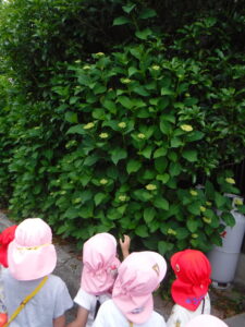 「あっこのまえより さきそうになってる」あじさいの花が咲きそうになっていることを発見。
