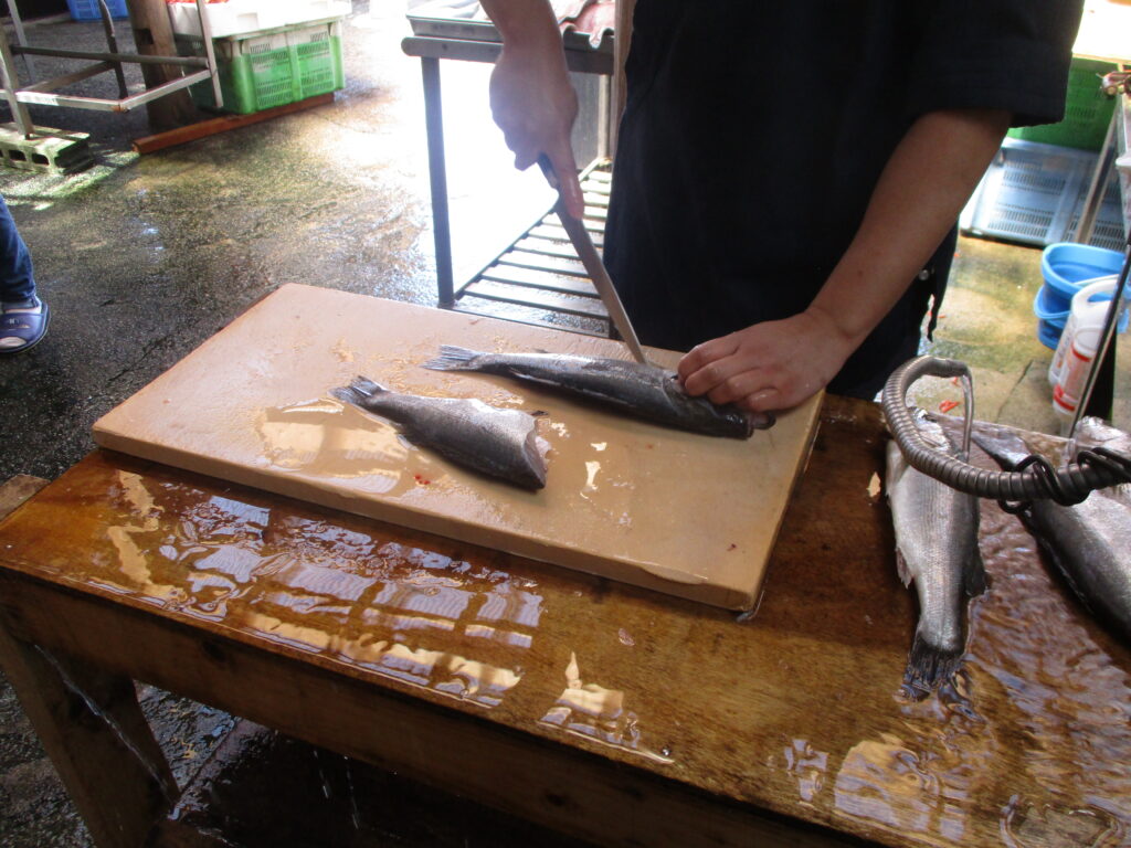 お待ちかねの解体ショー!はまちとせいごをさばくところを見せていただきました。