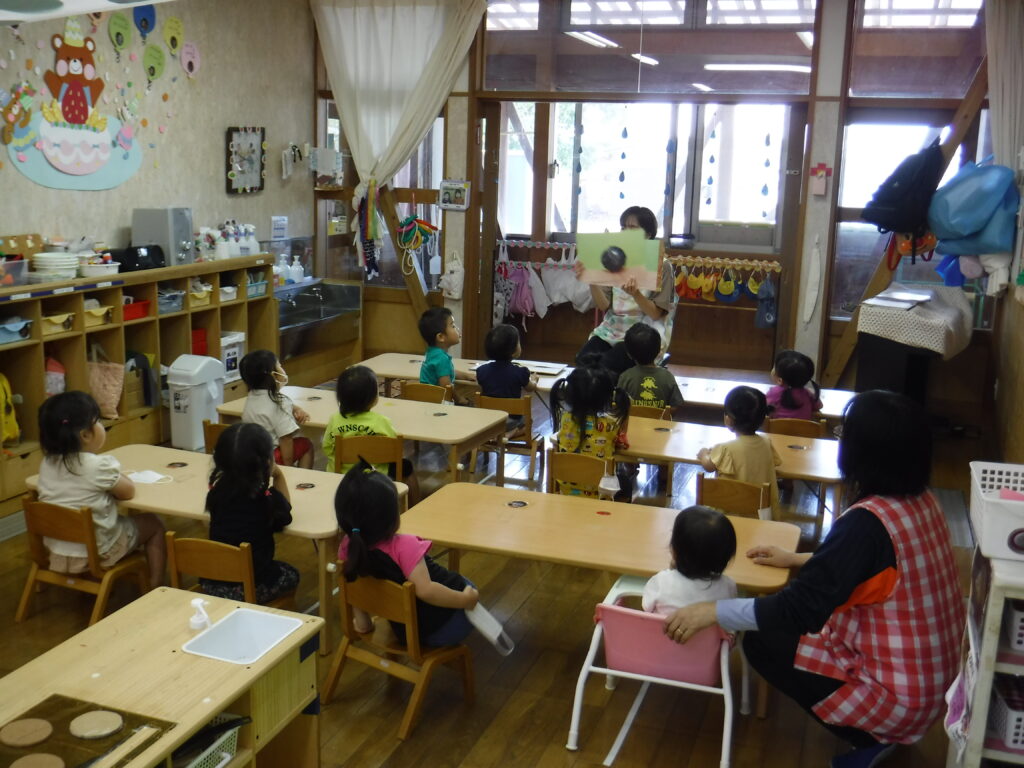 だんごむしの紙芝居をみています。みんな大好きだんごむし。この集中力です!