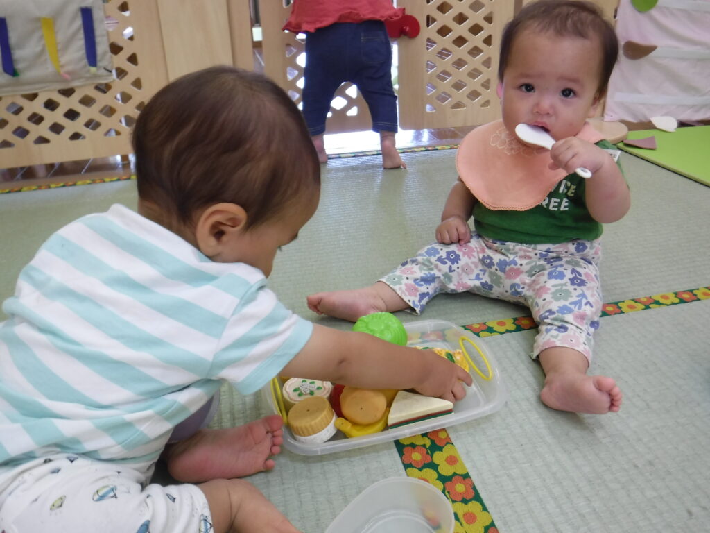 はなぐみ、今日はままごと遊び。ごちそうを掴んだり口に持っていったりしています。