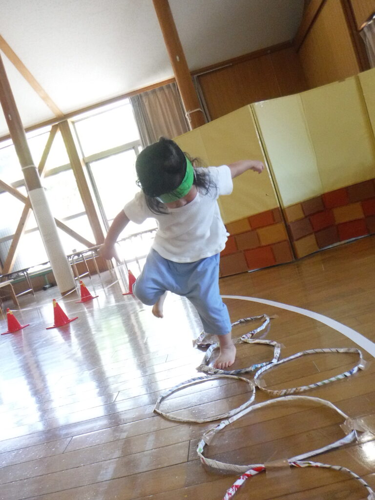 「けん、けん、ぱ」とリズムをとって体のバランスをとって、大人は当たり前のようにしますが、子どもにとっては難しいんです。おうちや外へ出た時に練習してみてください!
