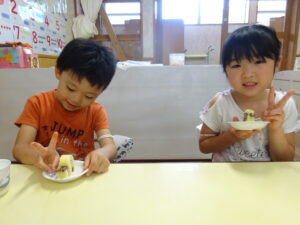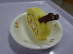 ロールケーキに小枝をさしてかたつむりに。かんたんで気分も上がるので、ぜひおうちでもやってみてください。ポッキーやプリッツなどでもできますよ。