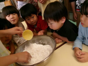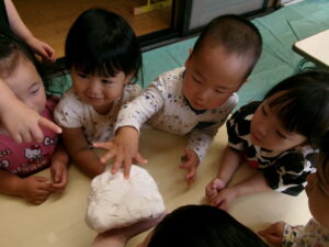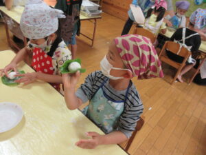 また、どんなおもちにしようか考えたり、イメージしたかたちにしようと指先を使ったり、子どもたちは遊びの中で色々なことを学んでいます。