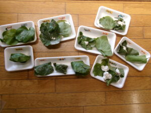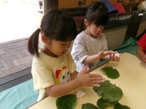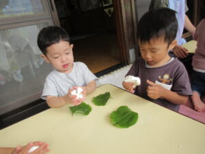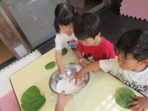 きのう取ってきた“かたらの葉”をつかってかしわもちを作ります。