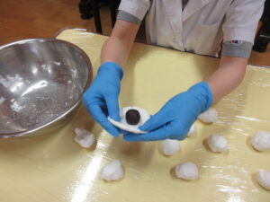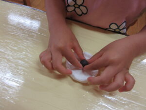「お皿の形にしてあんこを包むんだよ」給食先生のお手本を見ます