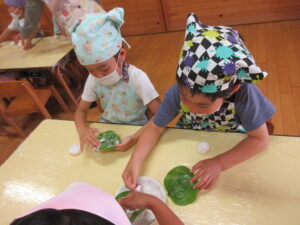 年長のぞう組はエプロン、三角巾、マスクをしてかしわもちクッキング。