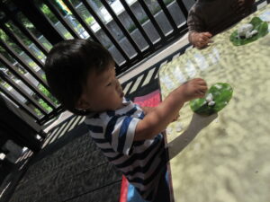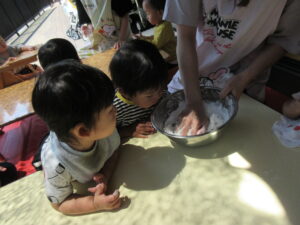 さらさらの粉から水に変わっていく様子を不思議そうに見る子どもたちです。