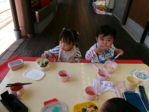 2025.04.21 4月うれしいお弁当! 今年度はじめてのお弁当の日。 とっても天気が良く、全クラス散歩に出かけました。 りす組は保育所の裏道 うさぎ、ぱんだ、きりん組は菅浦の池 ぞう組は片江のお大師参り それぞれの年齢に合った距離と行先を選んで楽しみました。 帰ってきたら楽しみなお弁当♪ あたたかかったのでみんなでテラスでいただきました。 お弁当の用意ありがとうございました♡ < 前の記事へ | 次の記事へ >