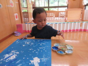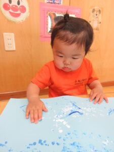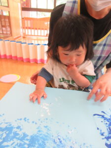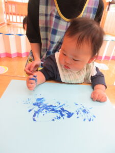 4月は絵の具の上にビニール袋を乗せ 手で触って感触を味わったり色を混ぜて楽しんだりして こいのぼりを作りました。