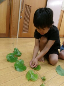 地域のおともだちも遊びに来てくれました。みんなだんごや葉っぱを触ってにぎって楽しんでいます。