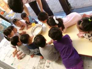 さらさらの粉に水を入れると、、、「かたまってきたー」