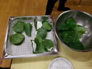 きのう、とってきたかたらの葉をきれいに洗って、今日のかしわ餅に使います。