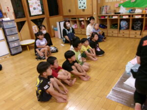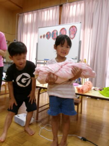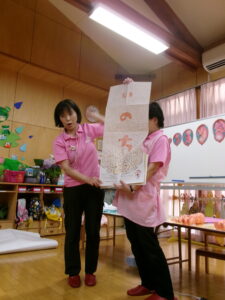 という話に始まり、おなかの中の赤ちゃんが成長していく様子や、赤ちゃんが生まれるときの様子を聞きました。