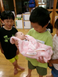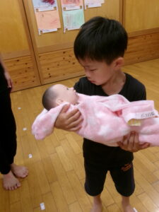生まれたての赤ちゃん(人形)を抱っこさせてもらいました。