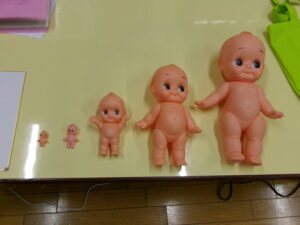 はじめはゴマ粒くらい小さな赤ちゃんが、どんどん大きくなっていく様子をキューピー人形で見ました。