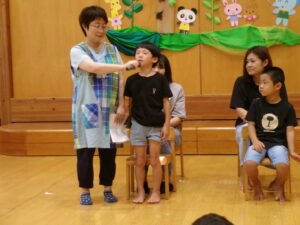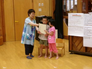 プレゼントにペンダントをぞう組から渡してもらいます。