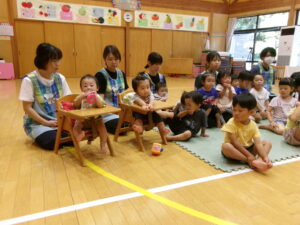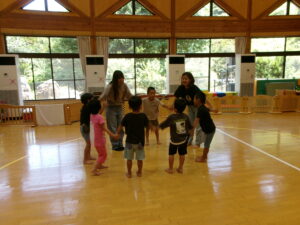 誕生会の後は、給食までおうちの人と一緒に ♪なべなべそこぬけ と
