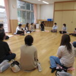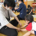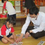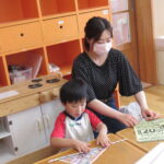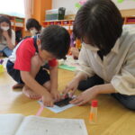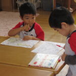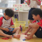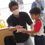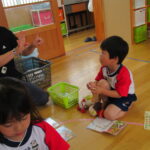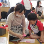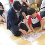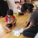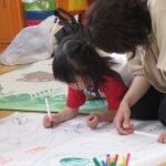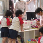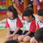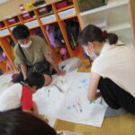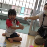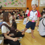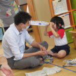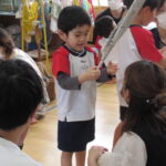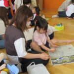 あいにくのお天気で、室内遊びになりましたが、新聞紙や広告紙、折り紙などを使って製作したり、大きな紙にお絵描きして遊びました。春はなかなか細く作れなかった剣を細く作れるようになり、何本も作ってはつなげてどこまで高くなるか試してみたり、紙飛行機を作って廊下で飛ばしたり、兵士のようなコスチュームを作ったりする姿がありました。お家の方と一緒にという時間が本当に嬉しそうで、いつも以上に笑顔をたくさん見せてくれました。久々にクラス懇談会を行い、担任が普段の様子を話したり、同じクラスの保護者さん同士顔を合わせながら自己紹介をしたりする時間を持つ事ができました。