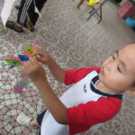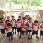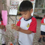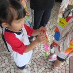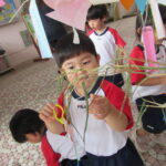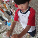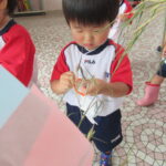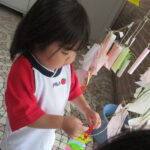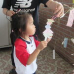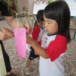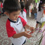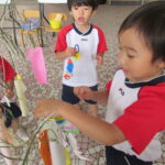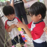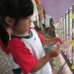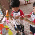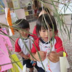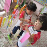2023.07.13 七夕飾りを飾ったよ ~すずらん組~ 雨のやみ間に、すずらんさんが玄関にやってきました。手には自分で作った七夕飾りを持って、「どこにつけようかなぁ」「よく見えるところがいいなぁ」と飾る場所を考えていましたよ。 昨日のばら組さんと同じく、かぶと虫が気になり、飼育ケースをのぞいてみたり、でも飾りつけたくて笹の方をみたり・・・。みんなが飾りつけた後は、笹の前で記念写真も撮りました。 < 前の記事へ | 次の記事へ >