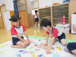 遊戯室ではカルタ取り、トランプ、お手玉、おはじき、折り紙を、ひまわり組ではめんこ、けん玉、コマ回しをしましたよ。