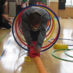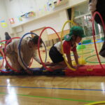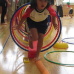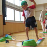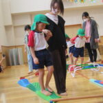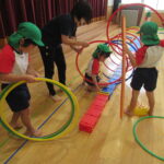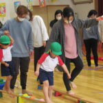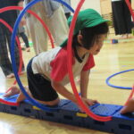 続いては『迷路遊び』。ミニ平均台、バランスキューブ、フープのトンネルなどを自分たちで運び、考えながら組み合わせて並べていきます。完成したら、お家の方も裸足になって一緒に遊びました。「これ、大人もくぐれますか?」と不安ながらも、体を小さく丸めてフープトンネルをくぐったり、細いミニ平均台を落ちないように渡ったりして遊びました。