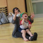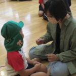 初めに、親子でふれあい遊びをしました。『こちょこちょじゃんけん』と『バスにのって』です。じゃんけんでは勝った方が負けた方にこちょこちょ攻撃~、でも最終的には負けた方も勝った方に逆攻撃~、終始笑顔でした。『バスにのって』では、お家の膝がバスの椅子がわり、もうそれだけで嬉しそうな子供達でした。前後で顔を見合わせる姿がとっても素敵でしたよ。