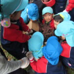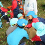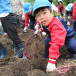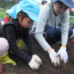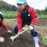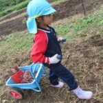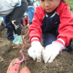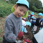 朝から♪いもほりするなら いんべのはたけの~♪と歌を口ずさむほど楽しみな様子でした。 畑について、いもほりの説明を受けたものの、「どこにおいもが・・・?」と不思議顔。「土の中にあるんだよ」と言われると、「いっぱいほるぞ~!」の掛け声と共に一斉に掘り始めました。その姿は、まるで人間耕運機のようでしたよ(笑)