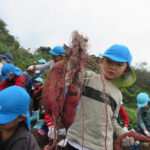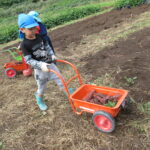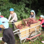 さあここからが大変です。大量の芋をバスまで運ばなくてはなりません。ダンボールや袋に入れたり、ミニリヤカーで運んだり・・・。最後はそれを大きなリヤカーに乗せて運びます。3~4人で運ぼうとしますが、びくともしません。「お~い 誰か手伝って~」その声にどんどん集まり、引っ張る人、後ろから押す人、横で支える人と協力し合って運ぶことができましたよ。掘って運んで、くたびれモードの子供達は、帰りのバスの中では静かだったようです。