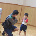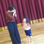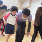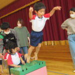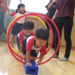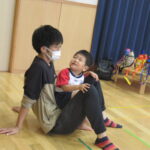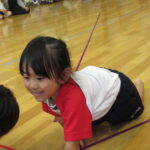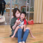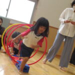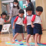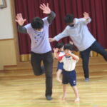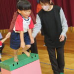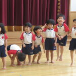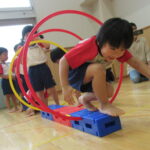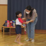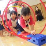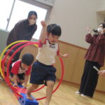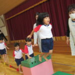 続いて、大好きな運動遊びです。ミニ平均台、ストーン、フープのトンネルなどをつなげて親子で遊びました。参観が始まってすぐは、たくさんの人にドキドキしていた子もいましたが、この時ばかりは、「みちょってよ~」「ジャンプ!」「ここは落ちらんように渡るよ」など普段遊んでる様子を見てもらいたいばら組さんでしたよ。