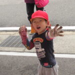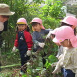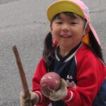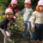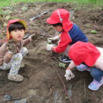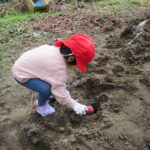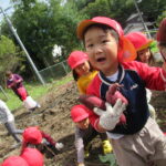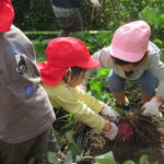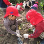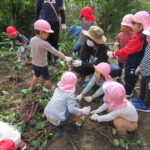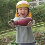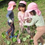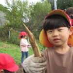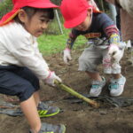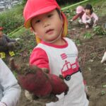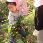 んで引っこ抜こうとしたり・・・。そして抜けると「先生~ でてきたよ~」「みてみて~」と大興奮。その声に周りの子供達も集まってきて、「ぼくもおいも欲しい~!」と。少しシャベルでお手伝いすると、あちらこちらでお芋の頭がのぞき、夢中で掘り出していましたよ。「でっかいね~」と子供たちの顔より大きなお芋も掘れて比べっこしていましたよ。