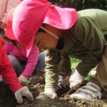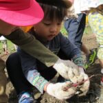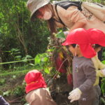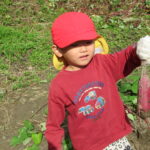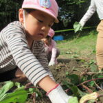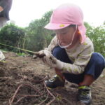 1人では力が足りないので、友だちと2人、3人で引っ張ります。あちこちで尻もちつく子も(笑)。そのうち紫色のお芋の頭がのぞくと「あった~」と小さな手で土をかきわけます。「うんしょうんしょ」と揺らしてみたり、そのままつか