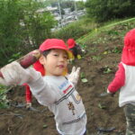 10月24日(月)すずらん・ばら組が園の畑でいもほりをしました。畑に上がるには急な斜面を登らなければなりません。「なんかこの坂道大変だなぁ」「遠いね~(実際めちゃくちゃ近い)」と言いながらなんとかあがりました。