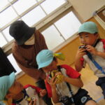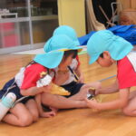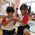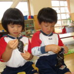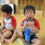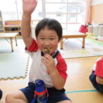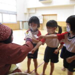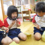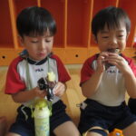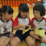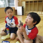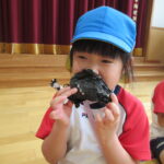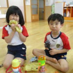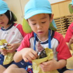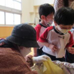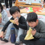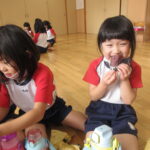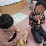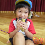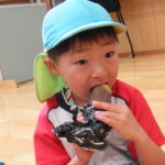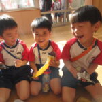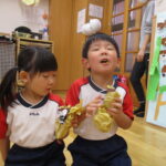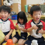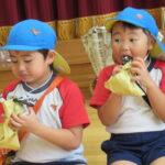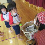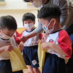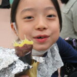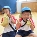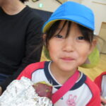 11月30日、保育園の遊戯室に焼きいも屋さんが来てくれました。「やきいも屋さんがきてくれたよ~。ゆうぎしつにきてください。やきいも券をお忘れなく~」と放送が聞こえると、3歳さんから順番にやってきました。遊戯室に入ると、♪いしや~きいも~ やきいも~♪とBGMがかかる中、背負子を持った焼きいも屋さんが待っていました。「おいもください」とやきいも券を渡し、袋に入った焼きたてのおいもをもらいましたよ。「あったかいね~」と中をのぞきこみ、早速いただきます。アルミホイルをはがすとおいもが出てきて、一口かじると黄色いほっかほっかのおいもが顔を出し、「あま~い」「おいし~」と笑顔いっぱいの子供たちでした。
