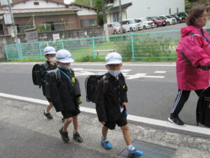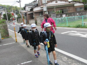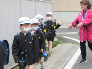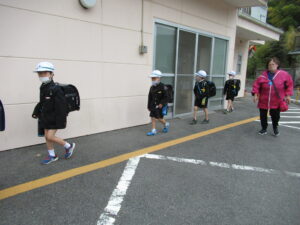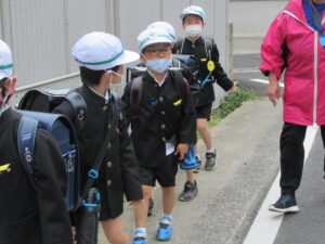 雑賀小学校の1年生が並んで歩いて帰ってきました。