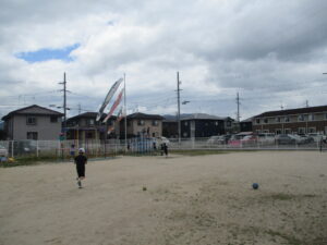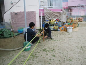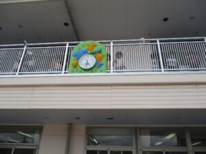 そして2階のバルコニーからは、れんげ組さんとたんぽぽ組さんが観察。「大きいね~」と下から声をかけると増して、キョロキョロ、ジーっと様子を見ていました。設置が終わった園庭では、運動会の振替休日で朝から登園していた学童さんが元気いっぱい遊びましたよ。学童さんも夏休みには、大きなプールに入りますよ。6月10日には、プール開きがあります。うっとうしい梅雨や夏を快適に過ごせるよう準備を始めていますよ~。