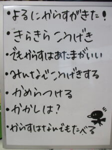 「きらきらこうげきしたら、いいんじゃない?」(CDをつるす)「せんせいたちが、よる、はたけをみとく!」などどんどん出てきたのですが・・・