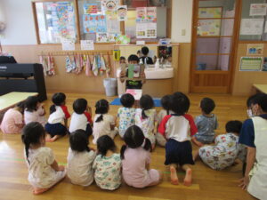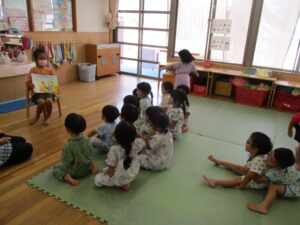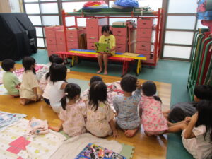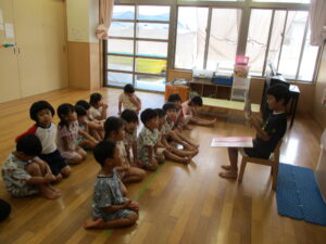 夏休みに入り、職員室横の部屋から元気のいい声がたくさん聞こえてきます。みつきっこクラブ(学童クラブ)の子どもたちです。代々続いている3年生による園児への読み聞かせタイムが今年もスタートしました。3年生が順番で一人ずつ、ばら組、きく組、ひまわり組に出向き、お昼寝前に紙芝居を読んでくれています。朝の活動時間には、紙芝居選び、読む練習をしています。幼児部の子どもたちも、お兄さん・お姉さんが来てくれることを楽しみに待っています。真剣なまなざしで紙芝居を聞いていますよ。次は何のお話かな~★
