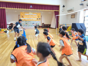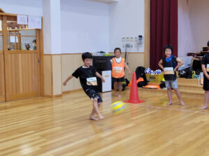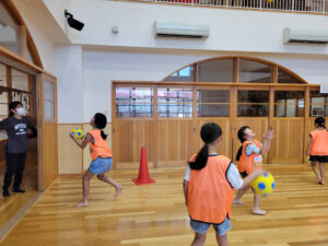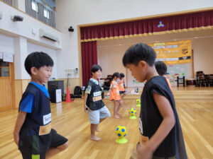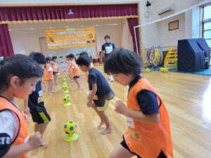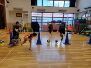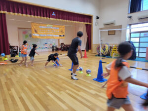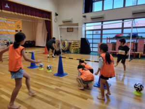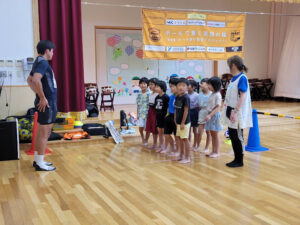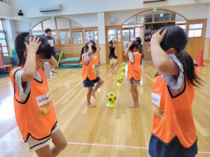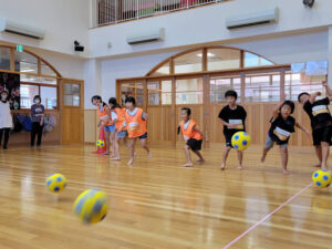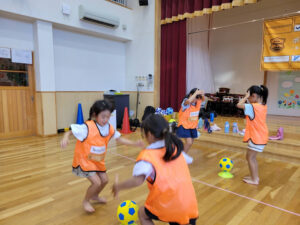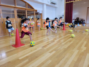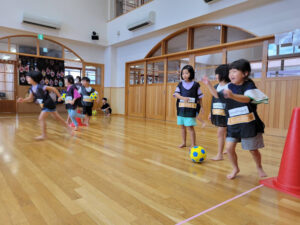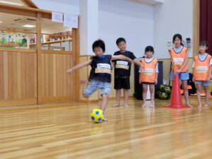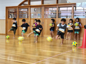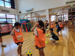 KEISHIサッカースクールから【ふなちゃん】こと船川コーチに来ていただき、みつきっこクラブの子どもたちが、ボールを使って運動遊びをしました。ボールを真上に投げてキャッチする、投げている間に5回手を叩く、頭・肩・お腹・背中をタッチするといったことから始まりました。自分の真上に投げること、高さを出すことがなかなかの高度のようで、あちらこちらに飛び、大笑い。やっていくうち成功させたい”という気持ちが芽生え、いつしか真剣な表情で集中モードでした。ボールに慣れてくると、ふなちゃんコーチがゴールキーパーをし、みんなは大きなゴールに向かってシュート体験!遊戯室で思いきり蹴れるとなると、子どもたちは、嬉しくてやる気マンマン!ゴール場所によっては、2点、1点と点数が入るので、自分がシュートを決めようと盛り上がりましたよ。ボールを通して、体を動かすことが楽しい子どもたちでした。次回はばら組さん、きく組さん、ひまわり組さん、そしてもう一度、みつきっこクラブさんも体験しますよ★