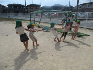 こちらは5歳児のひまわり組さん。真剣モードで園庭での取り組みが始まりました。