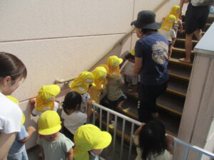 れんぽぽ組さんが、外階段を使ってお部屋に帰りますよ~!春の頃は四つ這いで登っていたのに、歩いて登ることができるようになりましたよ~👏
