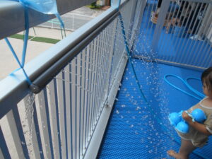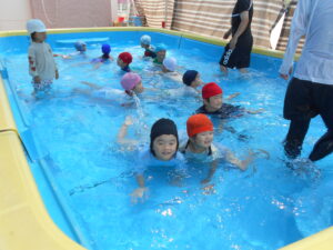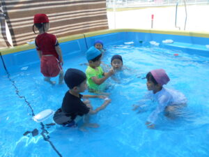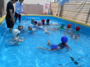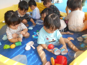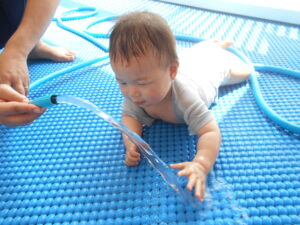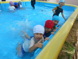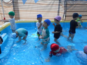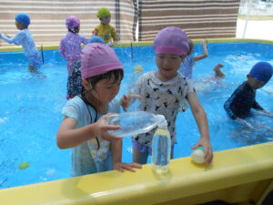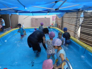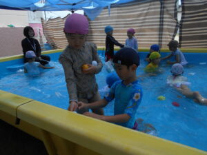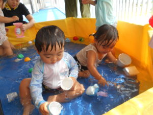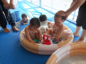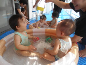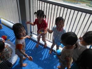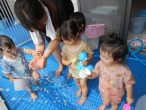 毎日が猛暑日!!お友だちや保育士と一緒に遊ぶ楽しさを感じるとともに、水の感触も味わいながら・・・子どもたちが体も心も気持ちよく快適に過ごせるよう水遊びをすすめています。