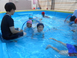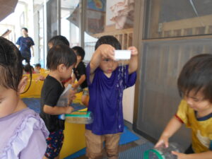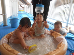 水遊びって楽しいね★なかには、顔に水がかかることが嫌な子どもたちも見受けましたが、回数を重ねるうちに